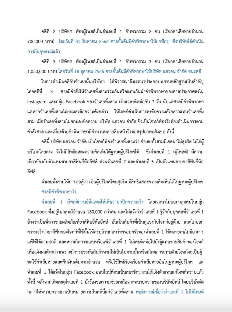 คดีที่ 3 บริษัทฯ ฟ้องผู้โพสต์เป็นจำเลยที่ 1 กับพวกรวม 3 คน (เรียกค่าเสียหายจำนวน 1,050,000 บาท) โดยวันที่ 18 ตุลาคม 2566 ศาลชั้นต้นมีคำพิพากษาให้บริษัท แฮวอน จำกัด ชนะคดี
