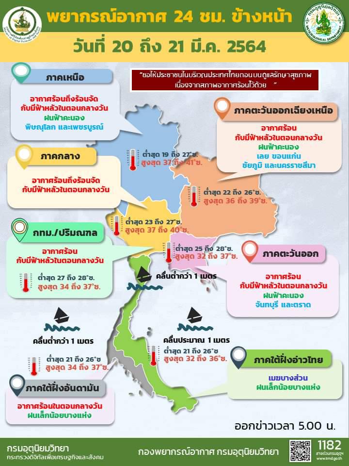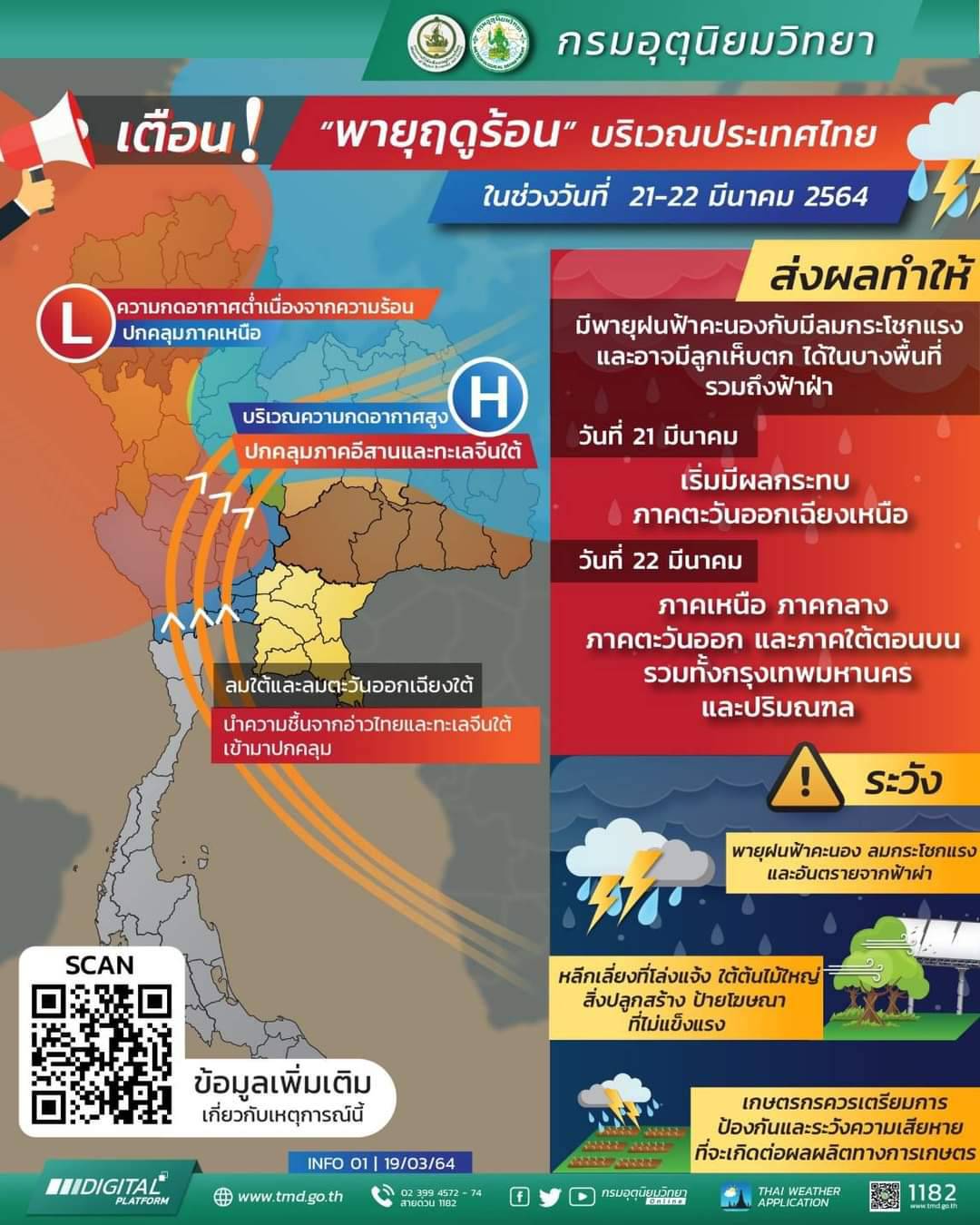 ดร.ทวีศักดิ์ ธนเดโชพล รองอธิบดีกรมชลประทาน เปิดเผยว่า ตามที่กรมอุตุนิยมวิทยาเตือน ฉบับที่ 2 (46/2564) ลงวันที่ 19 มีนาคม 2564 เรื่อง ” พายุฤดูร้อน บริเวณประเทศไทยตอนบน (มีผลกระทบตั้งแต่วันที่ 21 – 22 มีนาคม 2564)” เนื่องจากบริเวณความกดอากาศสูงหรือมวลอากาศเย็นกำลังค่อนข้างแรงจากประเทศจีนจะแผ่ลงมาปกคลุมประเทศไทยตอนบนและทะเลจีนใต้ ในขณะที่ประเทศไทยมีอากาศร้อนถึงร้อนจัด ส่งผลให้ประเทศไทยมีพายุฤดูร้อนเกิดขึ้น โดยมีลักษณะของพายุฝนฟ้าคะนองและลมกระโชกแรง รวมถึงอาจมีฟ้าผ่าเกิดขึ้นได้ กับมีลูกเห็บตกบางพื้นที่ นั้น