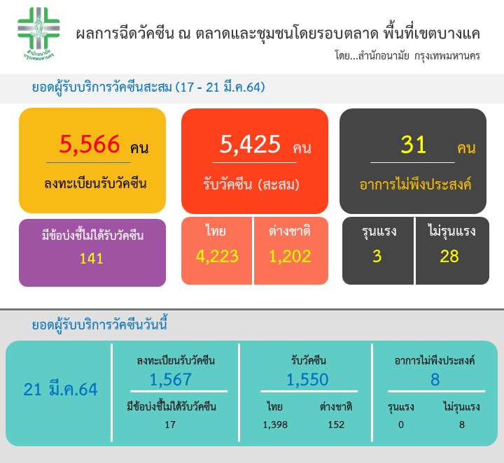 ทั้งนี้ เมื่อรวมการฉีดวัคซีนให้กับกลุ่มเสี่ยงย่านตลาดบางแค ตั้งแต่วันที่ 17 – 21 มี.ค. 64 รวมเป็นเวลา 5 วัน มีผู้ได้รับวัคซีนแล้ว จำนวน 5,425 คน ซึ่งกรุงเทพมหานคร ร่วมกับกรมการแพทย์ และกรมควบคุมโรค กระทรวงสาธารณสุข ยังคงให้บริการวัคซีนบริเวณดังกล่าวต่อเนื่องอีกหนึ่งวันถึงวันที่ 22 มีนาคมนี้ เพื่อบริการผู้มีความเสี่ยงสูงในย่านดังกล่าวให้ได้รับวัคซีนครบถ้วนตามที่คาดการณ์ไว้ประมาณ 6,000 คน
