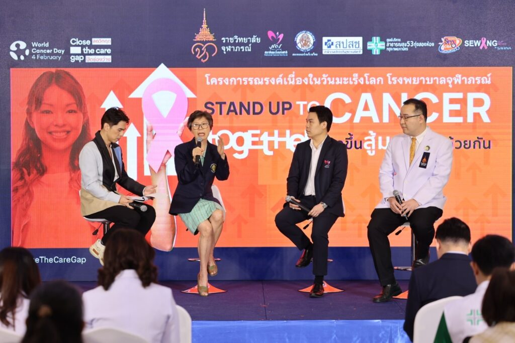 สำหรับโครงการรณรงค์ Stand up to CANCER Together ลดวิกฤต ปิดช่องว่าง ลุกขึ้นสู้มะเร็งไปด้วยกัน ได้จัดบริการวิชาการเสวนาให้ความรู้ครอบคลุมทุกมิติของโรคมะเร็งจากคณะแพทย์ โรงพยาบาลจุฬาภรณ์ ราชวิทยาลัยจุฬาภรณ์ และภาคีเครือข่ายโดยมีดีเจเอกกี้-เอกชัย เอื้อสังคมเศรษฐ์ เป็นผู้ดำเนินรายการเสวนา เริ่มด้วยการเสวนาช่วง “ยืนหยัดลุกขึ้นป้องกันมะเร็ง” โดย ผศ.พญ.สุวนิตย์ ธีระศักดิ์วิชยา ผู้รั้งตำแหน่งนายกสมาคมมะเร็งนรีเวชไทย นพ.ศุภกร พิทักษ์การกุล รองผู้อำนวยการด้านการแพทย์ สถาบันมะเร็งแห่งชาติ และ ผศ.นพ.ณัฐวุฒิ กันตถาวร รักษาการผู้ช่วยคณบดีฝ่ายบริการวิชาการและสังคม วิทยาลัยแพทยศาสตร์ศรีสวางควัฒน ราชวิทยาลัยจุฬาภรณ์