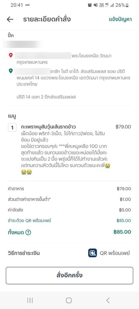 จากภาพจะเห็นว่าเจ้าของโพสต์ สั่งกะเพราหมูสับวุ้นเส้นราดข้าว ไข่ดาว 2 ฟอง ราคา 79 บาท รวมค่าส่งเป็นเงิน 85 บาท พร้อมระบุหมายเหตุว่า “พี่คะหนูเหลือเงิน 100 บาทสุดท้ายแล้ว รบกวนขอข้าวเยอะหน่อยได้ไหมคะ จะแบ่งกินเป็น 2 มื้อ พรุ่งนี้ก็ได้ไปทำงานแล้วค่ะ แต่ทนความหิววันนี้ไม่ไหว รวบกวนด้วยนะคะพี่” ปรากฏว่าเมื่อออเดอร์มาส่ง นอกจากร้านจะใส่ข้าวมาให้แบบล้น ๆ ยังแถมของกินมาให้อีก 1 ถุง พร้อมระบุว่า “แถมฟรีครับ สู้ ๆ”