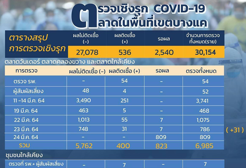 ตรวจเชิงรุกคลัสเตอร์ตลาดบางแค แล้ว 30,154 ราย พบติดเชื้อโควิดเพิ่ม 56 ราย รวมสะสม 536 ราย รอผลอีก 2,540 ราย