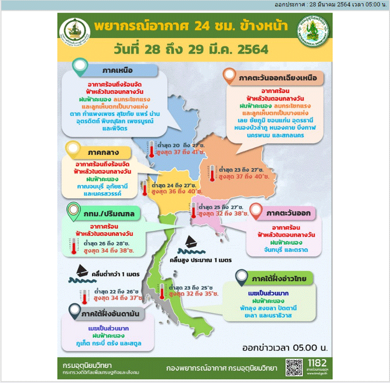 ลักษณะอากาศทั่วไป พยากรณ์อากาศ 24 ชั่วโมงข้างหน้า ความกดอากาศต่ำเนื่องจากความร้อนปกคลุมประเทศไทยตอนบน ทำให้บริเวณดังกล่าวมีอากาศร้อนหลายพื้นที่และมีอากาศร้อนจัดบางแห่งในภาคเหนือ ภาคตะวันออกเฉียงเหนือ และภาคกลางกับมีฟ้าหลัวในตอนกลางวัน