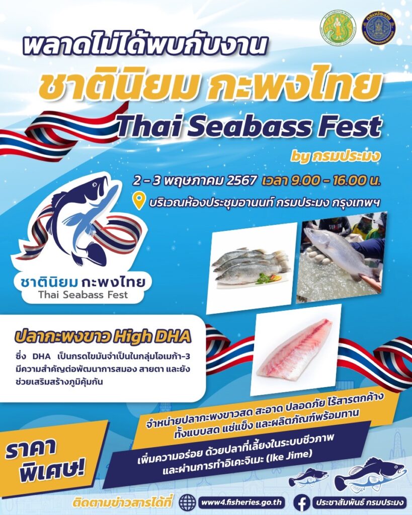 ‘และเพื่อให้เป็นไปตามนโยบายของกระทรวงเกษตรและสหกรณ์ จึงได้มอบหมายให้กรมประมงจัดงานโครงการกรมประมงรวมใจชวนคนไทยร่วมใจบริโภคปลากะพงขาว ภายใต้ธีม “ชาตินิยม กะพงไทย (Thai Seabass Fest)” ในวันที่ 2 – 3 พฤษภาคม 2567 ณ บริเวณห้องประชุมอานนท์ กรมประมง บางเขน กรุงเทพฯ โดยการนำสินค้าปลากะพงขาวและผลิตภัณฑ์ในหลากหลายรูปแบบที่ผลิตจากฟาร์มที่ได้การรับรองมาตรฐานการเพาะเลี้ยงสัตว์น้ำที่ดี สด สะอาด และปลอดภัยนำมาจำหน่ายให้กับผู้บริโภคภายในประเทศได้เข้าถึงสินค้าคุณภาพอย่างแพร่หลาย ทั้งในรูปแบบการจำหน่ายสินค้าที่หน้าร้าน และการจำหน่ายสินค้าด้วยช่องทางออนไลน์โดยไม่ต้องผ่านพ่อค้าคนกลาง เพื่อเป็นการกระตุ้นกระแสการบริโภคปลากะพงขาวของไทยและสร้างความรู้ความเข้าใจในกระบวนการผลิตปลากะพงขาวที่มีคุณภาพ นอกจากนี้ยังได้กำหนดกิจกรรมเจรจาธุรกิจระหว่างเกษตรกรผู้เลี้ยงปลากะพงขาวและผู้แทนจากร้านค้าปลีก/ห้าง/สมาคม เพื่อเพิ่มช่องทางการตลาด รวมทั้งยังเป็นการช่วยเหลือและบรรเทาความเดือดร้อนให้แก่เกษตรกรอีกช่องทางหนึ่ง
