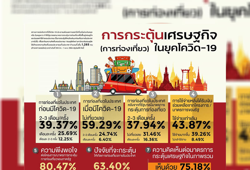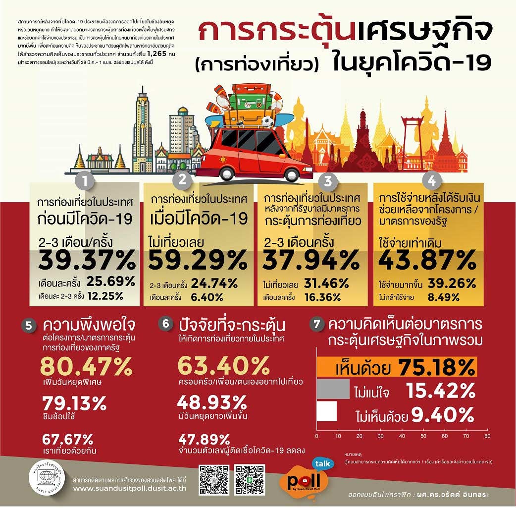สวนดุสิตโพล มหาวิทยาลัยสวนดุสิตสำรวจความคิดเห็นของประชาชนทั่วประเทศ จำนวนทั้งสิ้น 1,265 คน เรื่อง การกระตุ้นเศรษฐกิจ (การท่องเที่ยว) ในยุคโควิด-19 ระหว่างวันที่ 29 มี.ค.- 1 เม.ย. 2564 ก่อนมีโควิด-19