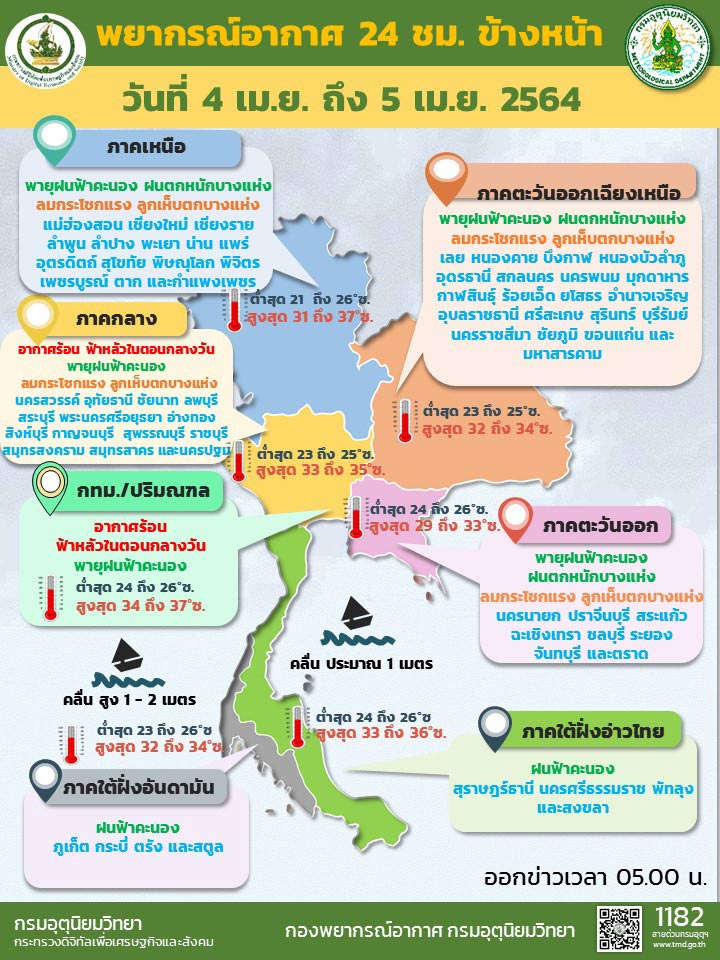 กรมอุตุนิยมวิทยาออกประกาศฉบับที่ 11 เตือน พายุฤดูร้อน บริเวณประเทศไทย ระบุว่า ในช่วงวันที่ 4-6 เมษายน 2564 ประเทศไทยจะมีพายุฤดูร้อนเกิดขึ้น โดยมีลักษณะของพายุฝนฟ้าคะนอง ลมกระโชกแรง และมีลูกเห็บตกบางพื้นที่ รวมถึงมีฟ้าผ่าเกิดขึ้น โดยจะมีฝนตกหนักบางแห่งเริ่มมีผลกระทบ ในภาคตะวันออกเฉียงเหนือ และภาคตะวันออกก่อน ส่วนภาคเหนือ ภาคกลาง รวมทั้งกรุงเทพมหานครและปริมณฑล และภาคใต้ตอนบน จะได้รับผลกระทบในระยะต่อไป