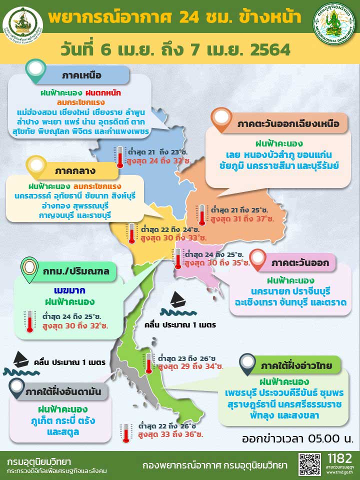 พยากรณ์อากาศสำหรับประเทศไทยตั้งแต่เวลา 06:00 วันนี้ ถึง 06:00 วันพรุ่งนี้