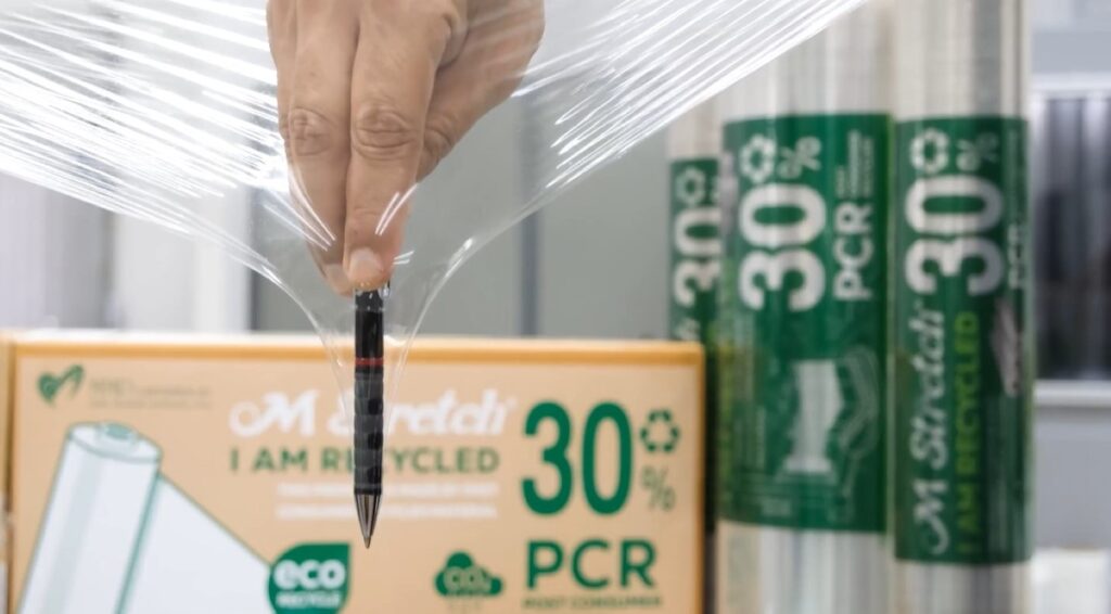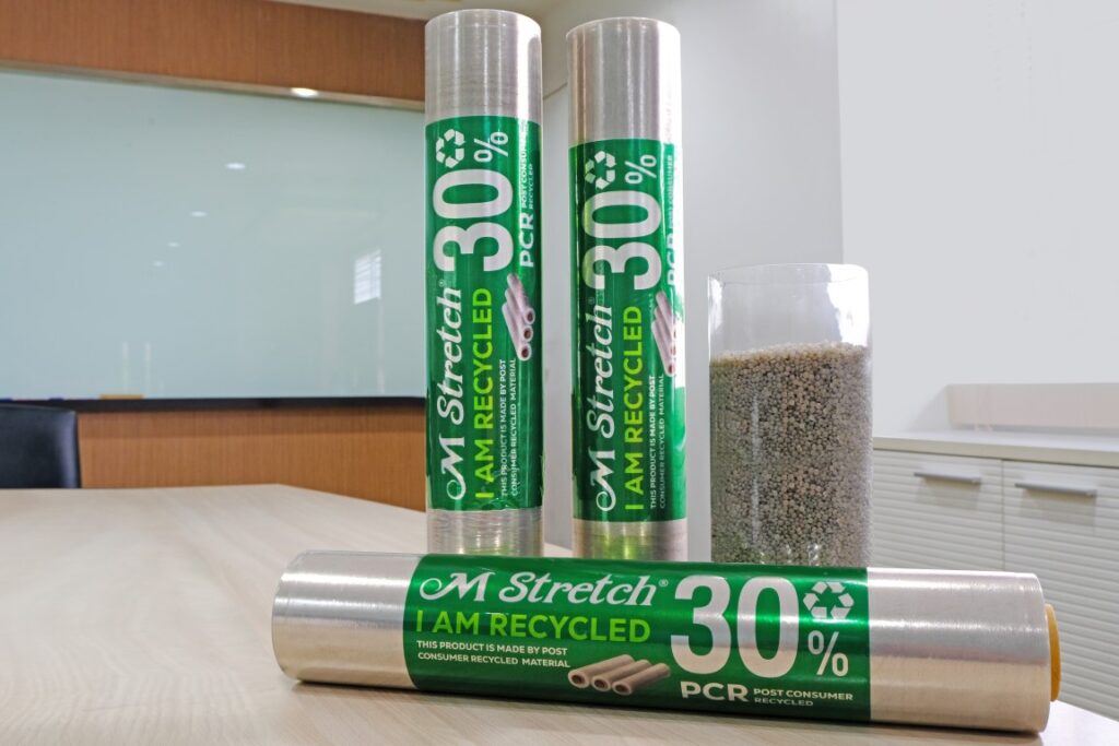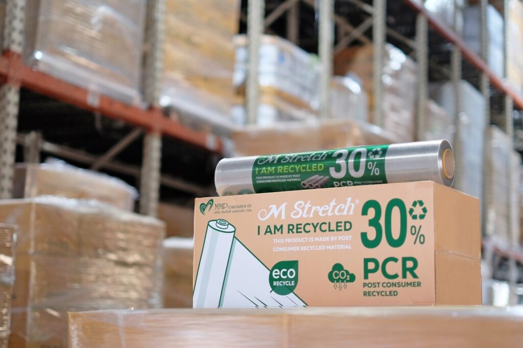 ทางเลือกใหม่ของธุรกิจนำเข้าส่งออก ฟิล์มยืดพันสินค้า “รักษ์โลก”เอ็มเอ็มพีฯ พัฒนาต่อยอดนวัตกรรมใหม่ ฟิล์มยืดพันสินค้า ภายใต้แบรนด์ “M Stretch” (เอ็ม เสตรช) ที่มีส่วนผสมของเม็ดพลาสติกรีไซเคิล (Post – Consumer – Recycled resin : PCR) มากถึง 30% ซึ่งถือว่าเป็นสัดส่วนที่สูงที่สุดในตลาดตอนนี้ ตอบโจทย์ Circular Economy เศรษฐกิจหมุนเวียนในการใช้ทรัพยากรที่มีอยู่อย่างคุ้มค่า ซึ่งการผลิตฟิล์มยืดจากเม็ดพลาสติกรีไซเคิล PCR นั้น ต้องอาศัยความเชี่ยวชาญ และความชำนาญในการผลิตสูง เพื่อที่จะสามารถผลิตฟิล์มยืดจากเม็ดพลาสติกรีไซเคิลให้มีคุณภาพเทียบเคียงกับฟิล์มยืดที่ผลิตมาจากเม็ดพลาสติกใหม่ได้สำเร็จ อีกทั้งยังคงคุณสมบัติที่ดีของฟิล์มยืดพันสินค้า อาทิ ความใส ความแข็งแรง ความเหนียว ความยืดหยุ่น และการยึดเกาะสินค้า ให้สามารถขนส่งได้อย่างปลอดภัย ซึ่งมีทั้งแบบพันด้วยมือ และพันด้วยเครื่องจักร ตอบโจทย์ผู้ประกอบการทุกกลุ่มเป้าหมาย ทั้งในประเทศ และภาคการส่งออก พร้อมชูไทยเป็นต้นแบบ เพื่อวางแผนขยายการใช้งานฟิล์มพันสินค้าไปยังประเทศอื่นๆ โดยที่ผู้ประกอบการสามารถควบคุมต้นทุน ลดค่าใช้จ่าย แถมยังตั้งเป้าในการช่วยลดขยะพลาสติกได้มากกว่า 100 ตันต่อปีอีกด้วย