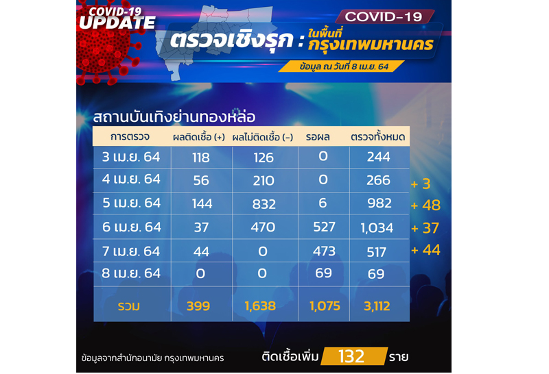วันนี้ (8 เม.ย.64) เมื่อเวลา 19.30 น. กรุงเทพมหานคร โดยสำนักงานประชาสัมพันธ์ รายงานผลการตรวจเชิงรุก สถานบันเทิงย่านทองหล่อ ระหว่างวันที่ 3 – 8 เม.ย. 64 พบผู้ติดเชื้อเพิ่ม 132 ราย โดยที่ผ่านมามีผู้เข้ารับการตรวจคัดกรองแล้วทั้งสิ้น 3,112 ราย ซึ่งในจำนวนนี้พบติดเชื้อ โควิด 399 ราย ไม่พบเชื้อ 1,638 ราย และ อยู่ระหว่างรอผล จำนวน 1,075 ราย