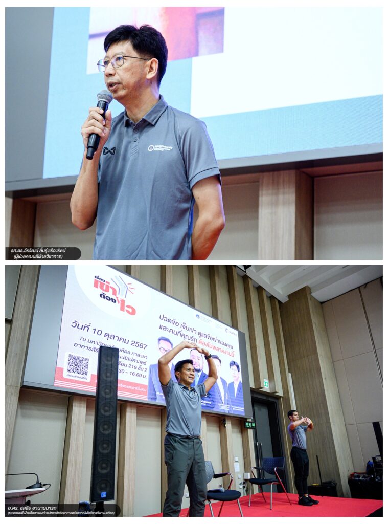 แคมเปญ “เรื่องเข่าต้องไว” ประจำปี 2567 จัดขึ้นที่มหาวิทยาลัยมหิดล ศาลายา อาคารสิริวิทยา คณะศิลปศาสตร์ ห้องเรียน 219 ชั้น 2 เมื่อวันที่ 10 ตุลาคม 2567 เวลา 08.30 น. – 16.00 น. โดยมีกิจกรรมน่าสนใจภายในงาน อาทิ พบปะพูดคุยกับผู้เชี่ยวชาญให้ความรู้และวิธีออกกำลังกายอย่างถูกต้อง สามารถออกกำลังกายได้เองจากอุปกรณ์ภายในบ้าน โดยมี อ.ดร. ชลชัย อานามนารถ (รองคณบดี ฝ่ายสื่อสารองค์กร) รศ.ดร.วีรวัฒน์ ลิ้มรุ่งเรืองรัตน์ (ผู้ช่วยคณบดีฝ่ายวิชาการ) รศ.นพ. กรกฤษณ์ ชัยเจนกิจ (แพทย์ผู้เชี่ยวชาญ) ดูแลอย่างใกล้ชิด มี อ.ดร.จิราวัฒน์ ปรัตถกรกุล (นักโภชนาการ) มาให้ความรู้ด้านอาหารให้ถูกหลักโภชนาการ และยังมีนางสาวฉัตรลาดา ภาวงศ์ มาช่วยสอนการออกกำลังกายในน้ำ หรือแม้แต่การตรวจเช็กข้อเข่าฟรีภายในงาน นับเป็นกิจกรรมที่มีประโยชน์มาก