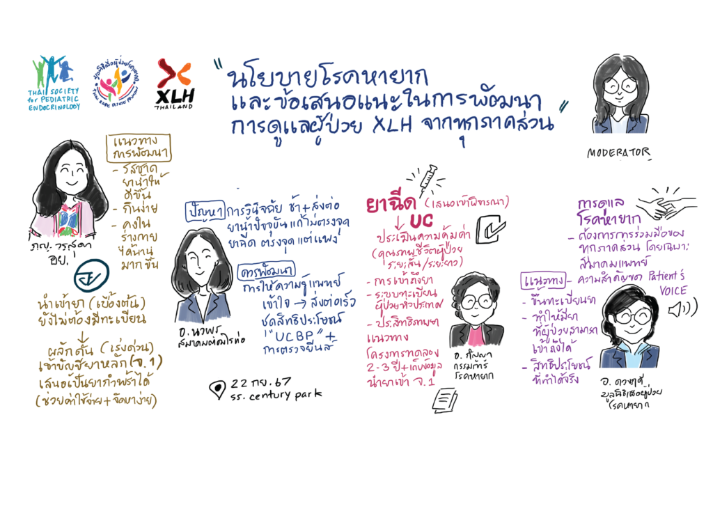 สิ่งที่น่าสนใจ ได้มีการพูดถึง นโยบายโรคหายาก และข้อเสนอแนะในการพัฒนา การดูแลผู้ป่วย XLH จากทุกภาคส่วน โดยได้รับเกียรติจากหน่วยงานทางภาครัฐและผู้มีส่วนร่วมในทุกภาคส่วน มาร่วมแลกเปลี่ยนข้อมูล รวมถึงประสบการณ์ที่เป็นประโยชน์  ประกอบด้วย ศ.ดร.พญ. กัญญา ศุภปีติพร ประธานร่วมคณะทำงานพัฒนาระบบบริการดูแลรักษาโรคหายาก, ภญ.วรสุดา ยูงทอง ผู้อำนวยการกองยา สำนักงานคณะกรรมการอาหารและยา,  ศ.พญ.ดวงฤดี วัฒนศิริชัยกุล รองประธานมูลนิธิเพื่อผู้ป่วยโรคหายาก, รศ.พญ.นวพร นำเบญจพล แพทย์ผู้เชี่ยวชาญโรคต่อมไร้ท่อในเด็ก และ  ผศ.พญ. วรลักษณ์ ภัทรกิจนิรันดร์ แพทย์ผู้เชี่ยวชาญโรคต่อมไร้ท่อในเด็ก สมาคมต่อมไร้ท่อเด็กและวัยรุ่นไทยเล็งเห็นความสำคัญในการดูแลผู้ป่วยโรคหายาก XLH และมีแผนสนับสนุน การสร้างความตระหนักรู้โรค XLHและการส่งต่อผู้ป่วยเพื่อเข้ารับการรักษาอย่างเหมาะสม นอกจากนี้ยังมีการเตรียมร่างเสนอการวินิจฉัยโรคXLH เข้าสู่ชุดสิทธิประโยชน์ภายใต้ระบบหลักประกันสุขภาพแห่งชาติ รวมถึงการสนับสนุนการเข้าถึงยาทั้งในรูปแบบเม็ดและรูปแบบฉีดอย่างเหมาะสม