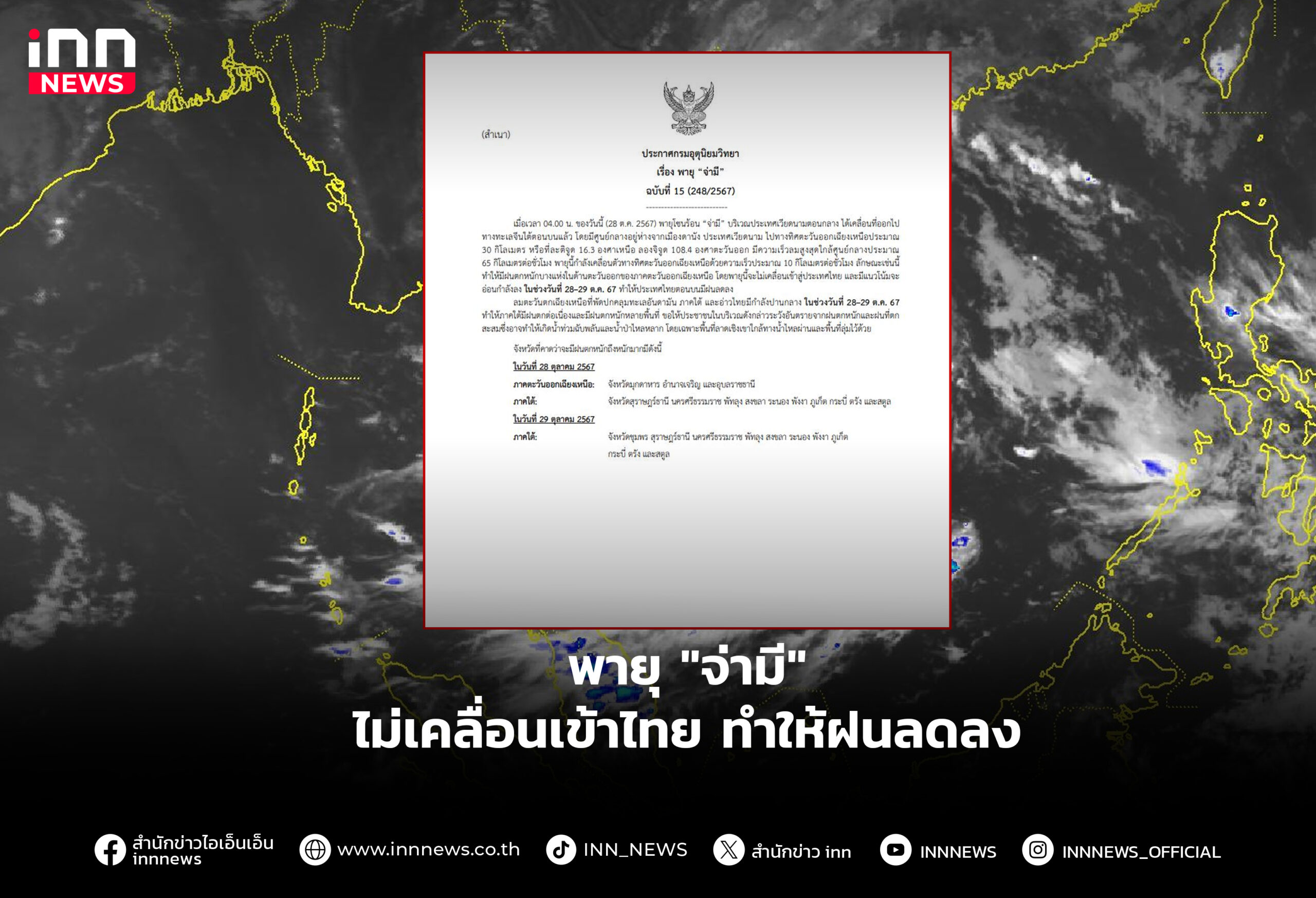 ประกาศกรมอุตุนิยมวิทยา ฉบับที่ 15 เรื่อง พายุ “จ่ามี” ไม่เคลื่อนเข้าไทย ทำให้ฝนลดลง