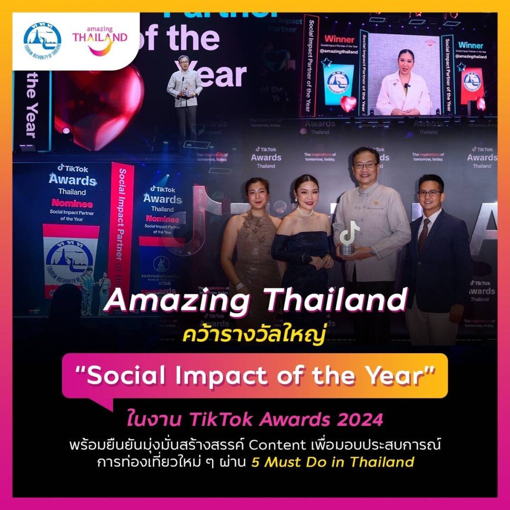 การท่องเที่ยวแห่งประเทศไทย (ททท.) ในฐานะองค์กรที่เป็นผู้นำในการส่งเสริมการท่องเที่ยว นำเสนอภาพลักษณ์ประเทศไทยไปสู่สายตานักท่องเที่ยวทั้งชาวไทยและชาวต่างชาติทั่วโลก ภาคภูมิใจกับรางวัล TikTok Awards Thailand 2024 สาขา “Social Impact Partner of the Year” หรือ พาร์ทเนอร์ผู้ขับเคลื่อนสังคมดีเด่นแห่งปี ในงาน TikTok Awards Thailand 2024 งานประกาศรางวัลสุดยอดครีเอเตอร์ผู้สร้างคอนเทนต์ที่สุดแห่งปี