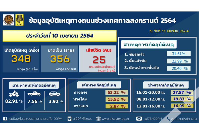กรมป้องกันและบรรเทาสาธารณภัย ศูนย์อำนวยการป้องกันและลดอุบัติเหตุทางถนนช่วงเทศกาลสงกรานต์ พ.ศ.2564 สรุปสถิติอุบัติเหตุทางถนนประจำวันที่ 11 เมษายน 2564 เกิดอุบัติเหตุ 348 ครั้ง ผู้เสียชีวิต 25 ราย ผู้บาดเจ็บ 356 คน
