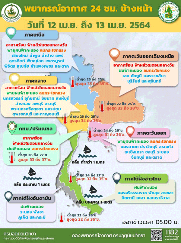 พยากรณ์อากาศ 24 ชั่วโมงข้างหน้า บริเวณความกดอากาศสูงหรือมวลอากาศเย็นกำลังปานกลางจากประเทศจีนยังคงแผ่ปกคลุมประเทศไทยตอนบนและทะเลจีนใต้ ส่งผลทำให้มีลมใต้และลมตะวันออกเฉียงใต้พัดปกคลุมภาคเหนือตอนล่าง ภาคตะวันออกเฉียงเหนือตอนล่าง ภาคกลาง ภาคตะวันออก รวมทั้งกรุงเทพมหานครและปริมณฑล ในขณะที่ประเทศไทยตอนบนมีอากาศร้อน ลักษณะเช่นนี้ทำให้ประเทศไทยตอนบนมีพายุฝนฟ้าคะนองและลมกระโชกแรงเกิดขึ้นได้บางพื้นที่