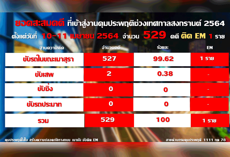 คุมประพฤติเมาขับสงกรานต์ 2 วัน สะสมรวม 527 คดี – จ.สมุทรปราการเมาแล้วขับมากสุด 58 คดี