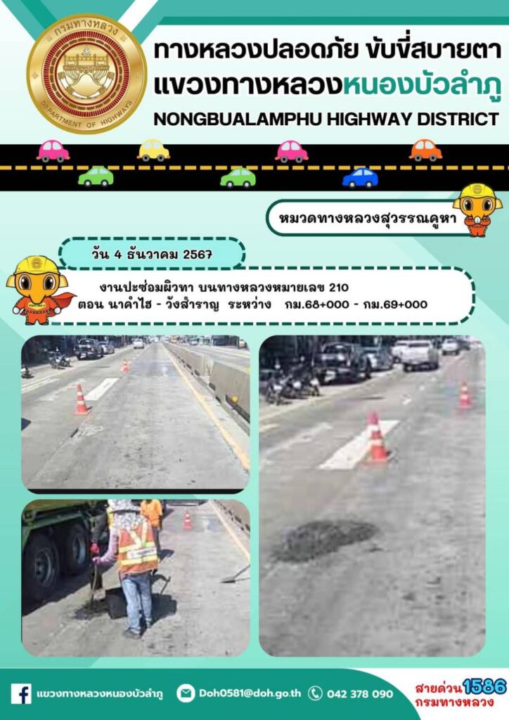 ทั้งนี้ จากสอบถามเรื่องการจัดการ ความปลอดภัย ของประชาชนที่จัดให้เบี่ยงไปจุดที่มีหลุม. แต่ยังไม่ได้คำตอบ. วันนี้ฝากอีกคำถามสงสัยว่า ทำไมถนน 2 ฝั่งคุณภาพไม่เท่ากัน. จะมีการซ่อมถนน เส้น 210 ฝั่ง จังหวัดหนองบัวลำภู ไป จังหวัดเลย. ตลอดทั้งที่ เส้นทางนี้รถบรรทุกหินที่เป็นรถเปล่า ใช้เส้นนี้เพื่อไปขนหิน แล้ว เดินทางกลับ ถนน เส้นจาก จ.เลย ไป หนองบัวลำภู เพื่อส่งโรงโม่งหิน อ.นากลาง. ถนนไม่ค่อยเสียหาย ไม่มีการซ่อมมากกว่าอีกฝั่ง.