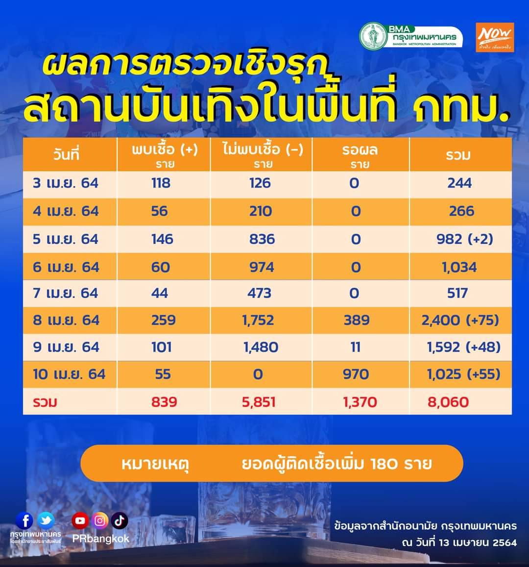 สำนักประชาสัมพันธ์กรุงเทพมหานคร สรุปผลการตรวจเชิงรุกสถานบันเทิงย่านทองหล่อ ข้อมูล ณ วันที่ 13 เมษายน 2564 ยืนยันพบผู้ป่วยรายใหม่ 180 ราย ส่งผลให้มีผู้ป่วยสะสมระลอกใหม่คลัสเตอร์สถานบันเทิง ระหว่างวันที่ 3 – 10 เม.ย. 64 รวม 839 ราย