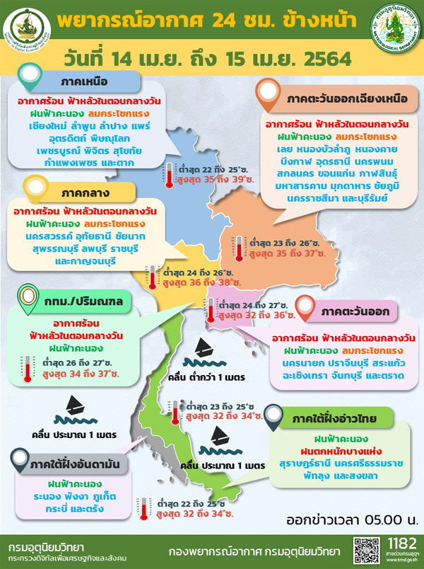 พยากรณ์อากาศ 24 ชั่วโมงข้างหน้า ความกดอากาศต่ำเนื่องจากความร้อนปกคลุมประเทศไทยตอนบน ลักษณะเช่นนี้ทำให้ประเทศไทยตอนบนมีอากาศร้อนกับมีฟ้าหลัวในตอนกลางวัน ในขณะที่ลมใต้และลมตะวันออกเฉียงใต้ยังคงพัดปกคลุมภาคเหนือตอนล่าง ภาคตะวันออกเฉียงเหนือตอนล่าง ภาคกลาง ภาคตะวันออก รวมทั้งกรุงเทพมหานครและปริมณฑล ทำให้ประเทศไทยตอนบนมีฝนฟ้าคะนองเกิดขึ้น กับมีลมกระโชกแรงบางพื้นที่