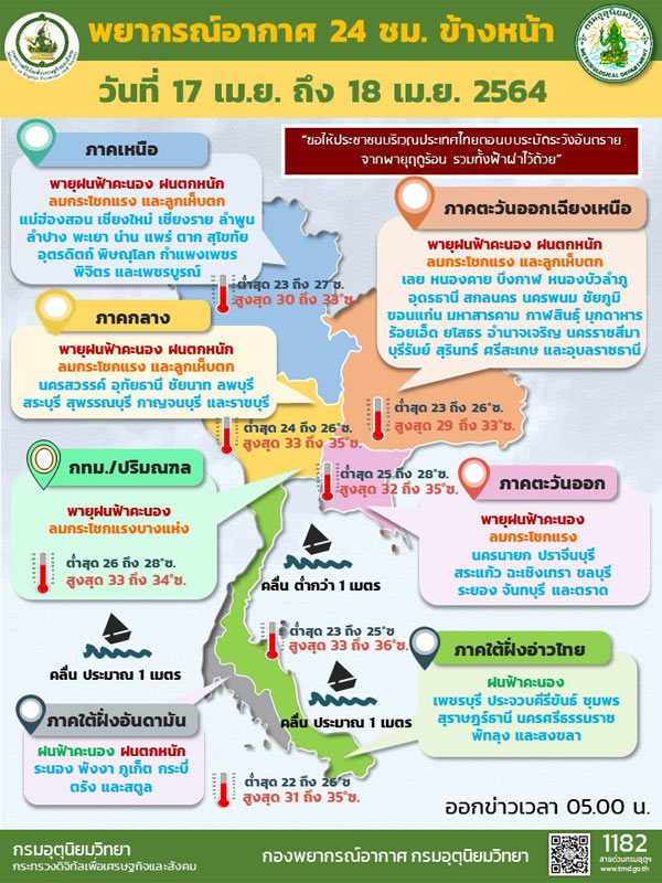 พยากรณ์อากาศ 24 ชั่วโมงข้างหน้า บริเวณภาคเหนือ ภาคตะวันออกเฉียงเหนือ ภาคตะวันออก และภาคกลาง รวมทั้งกรุงเทพมหานครและปริมณฑล มีพายุฤดูร้อนเกิดขึ้น โดยมีลักษณะของพายุฝนฟ้าคะนอง ลมกระโชกแรง มีลูกเห็บตก รวมถึงอาจมีฟ้าผ่าเกิดขึ้นกับมีฝนตกหนักบางแห่ง ขอให้ประชาชนบริเวณดังกล่าวระมัดระวังอันตรายจากพายุฤดูร้อน รวมทั้งฟ้าผ่าไว้ด้วย
