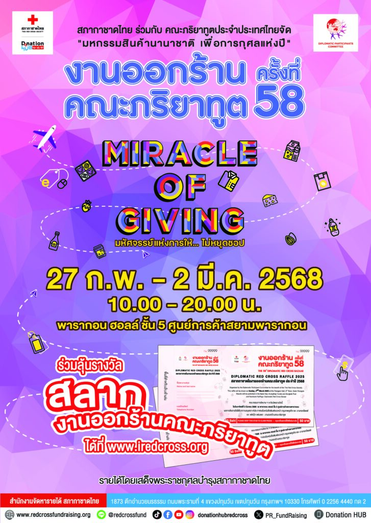 วันอังคารที่ 18 กุมภาพันธ์ 2568 Donation HUB สภากาชาดไทย ร่วมกับ คณะภริยาทูตประจำประเทศไทย จัดงานแถลงข่าว “งานออกร้านคณะภริยาทูต ครั้งที่ 58” ภายใต้แนวคิด “มหัศจรรย์แห่งการให้…ไม่หยุดชอป” (Miracle of Giving) โดยมี นายขรรค์ ประจวบเหมาะ ผู้อำนวยการสำนักงานจัดหารายได้ สภากาชาดไทย พร้อมด้วย นางปรัชญา ซิงห์ ภริยาเอกอัครราชทูตสาธารณรัฐอินเดีย ประธานคณะกรรมการจัดงานออกร้านคณะภริยาทูต ประจำปี 2568 Mdm. Trang Thi Thu Ho ภริยาเอกอัครราชทูตสาธารณรัฐสังคมนิยมเวียดนาม ประธานคณะกรรมการจัดทำสลากงานออกร้านคณะภริยาทูต ประจำปี 2568 นางจันทร์ประภา วิชิตชลชัย รองผู้อำนวยการสำนักงานจัดหารายได้ สภากาชาดไทย และผู้สนับสนุนการจัดงานร่วมเป็นเกียรติในงานแถลงข่าว ณ Main Entrance, พารากอน ฮอลล์ ชั้น 5 ศูนย์การค้าสยามพารากอน