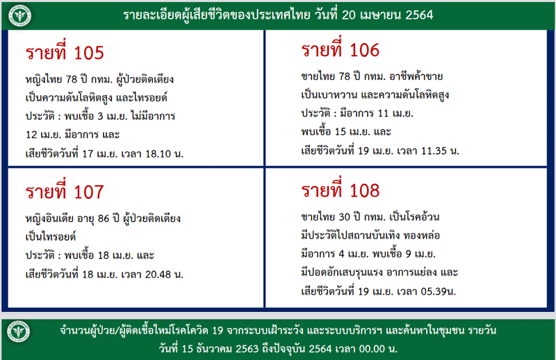 โดยผู้เสียชีวิตรายใหม่ เป็นผู้ป่วยหญิงไทย อายุ 78 ปี อยู่ที่กรุงเทพมหานคร เป็นผู้ป่วยติดเตียง มีโรคประจำตัว คือ ความดันโลหิตสูง และไทรอยด์ พบเชื้อไม่มีอาการวันที่ 3 เม.ย.64 วันที่ 12 เม.ย.64 เริ่มมีอาการ และเสียชีวิตวันที่ 17 เม.ย.64