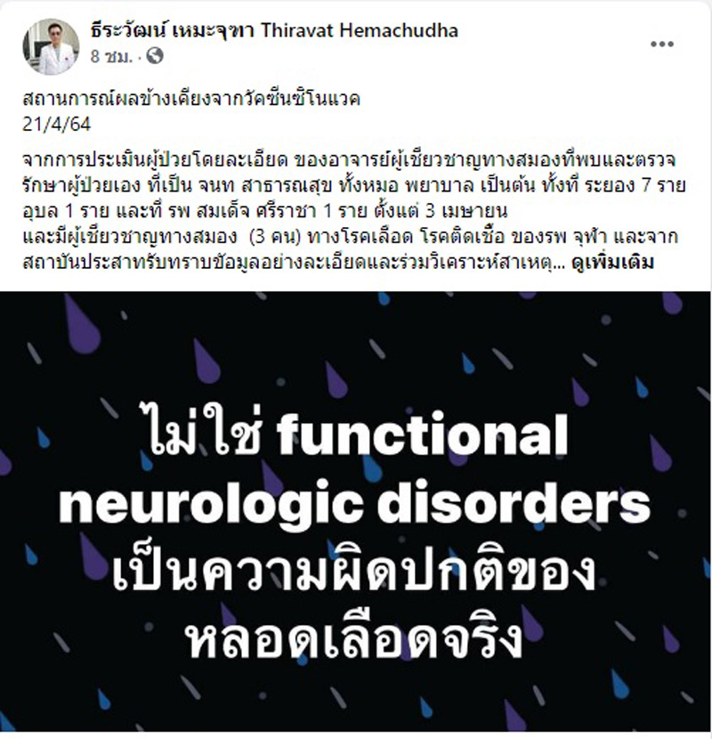ศ.นพ.ธีระวัฒน์ เหมะจุฑา ผู้อำนวยการศูนย์วิทยาศาสตร์สุขภาพโรคอุบัติใหม่ คณะแพทยศาสตร์ จุฬาลงกรณ์มหาวิทยาลัย ด้โพสต์เฟซบุ๊ก ธีระวัฒน์ เหมะจุฑา Thiravat Hemachudha ระบุข้อมูลเกี่ยวกับสถานการณ์ผลข้างเคียงของวัคซีนซิโนแวค โดยมีข้อความว่า
