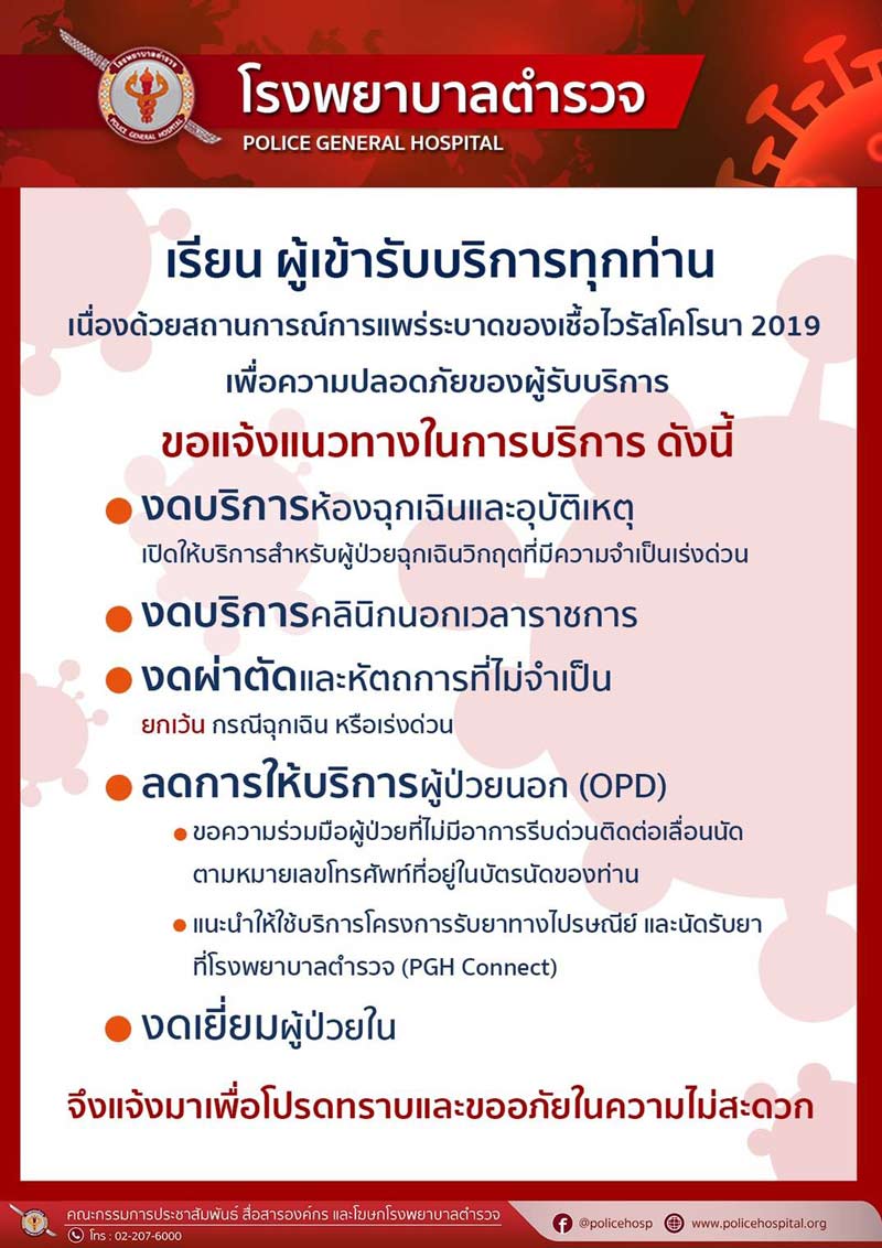 โรงพยาบาลตำรวจ ประกาศลดการให้บริการผู้ป่วย เปิดรับกรณีฉุกเฉินวิกฤติ ที่มีความจำเป็นเร่งด่วน – งดเยี่ยมผู้ป่วยใน เพื่อลดความเสี่ยงติดเชื้อโควิด-19