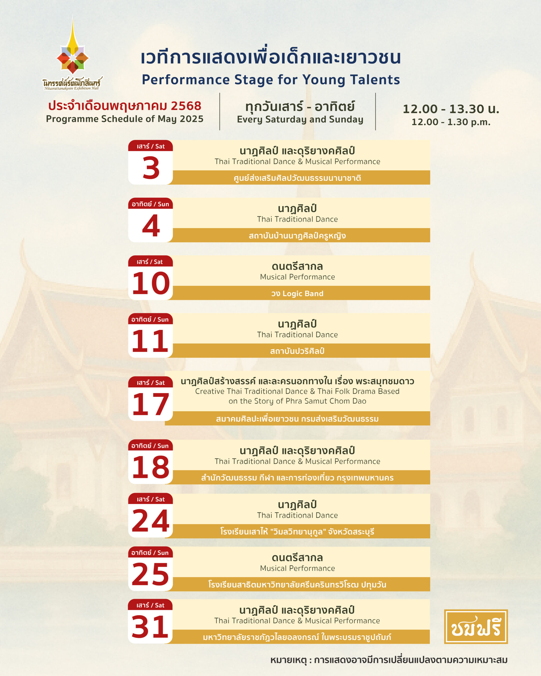 เวทีการแสดงเพื่อเด็กและเยาวชน นิทรรศน์รัตนโกสินทร์ เดือนพฤษภาคมนี้ พบกับการแสดงอันทรงคุณค่าทางศิลปวัฒนธรรม อาทิ การแสดงนาฏศิลป์สร้างสรรค์ ชุดตักบาตรข้าวหลามจี่ต๋ามฮีตเดิม น้อมเฉลิมพระวชิราลงกรณจอมราชันย์ โดย โรงเรียนเสาไห้ “วิมลวิทยานุกูล” จังหวัดสระบุรี รางวัลชนะเลิศ การแข่งขันนาฏศิลป์ไทยสร้างสรรค์ งานศิลปหัตถกรรมนักเรียน ครั้งที่ 72 ปีการศึกษา 2567 พร้อมด้วยการแสดงละครนอกทางใน เรื่อง พระสมุทชมดาว โดย สมาคมศิลปะเพื่อเยาวชน กรมส่งเสริมวัฒนธรรม พร้อมทั้งการแสดงด้านศิลปวัฒนธรรมที่หลากหลาย ชมฟรี ทุกวันเสาร์ – อาทิตย์ เวลา 12.00 – 13.30 นาฬิกา สอบถามเพิ่มเติม โทร. 09 5476 5868