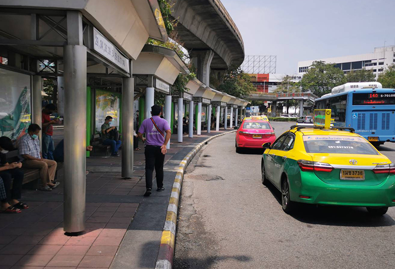 ในขณะที่ประชาชนที่รอใช้บริการรถโดยสารสาธารณะก็พบว่ามีจำนวนน้อยเช่น แต่ทุกคนให้ความร่วมมือในการนั่งเว้นระยะห่าง และสวมใส่หน้ากากอนามัย ส่วนพื้นที่โดยรอบที่มีจุดนั่งพัก พบว่า ประชาชนทุกคนต่างนั่งพักโดยเว้นระยะห่างระหว่างม้านั่ง และสวมใส่หน้ากากอนามัย เช่นเดียวกับบรรยากาศ ที่คิวรถตู้โดยสารประจำทาง สายอนุสาวรีย์ มีนบุรี ซึ่งผู้ขับขี่รถตู้โดยสาร เล่าว่า วันนี้มีประชาชนใช้บริการน้อยมาก เฉลี่ยแล้ว 1 คนต่อรถ 1 เที่ยว ซึ่งสวนทางกับค่าใช้จ่าย หรือต้นทุนของการวิ่งรถแต่ละเที่ยว ที่จะต้องเสียทั้งค่าน้ำมันและ ค่าทางด่วน ประกอบกับรถยังคงต้องวิ่งตามรอบเช่นเดิม คือทุก ๆ 30 นาที รถจะต้องออก ส่วนมาตรการ ป้องกันการแพร่ระบาด ของโรคโควิค-19 นั้น ทางคิวรถตู้ได้กำหนดให้ประชาชนต้องใส่หน้ากากอนามัยตลอดเวลาระหว่างอยู่ในรถตู้ และมีการเว้นที่นั่งภายในรถตู้ รวมถึงภายในรถมีเจลแอลกอฮอล์ไว้บริการ