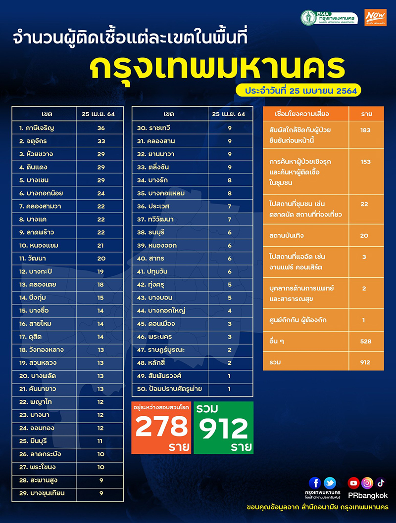 กรุงเทพมหานคร สรุปข้อมูลจำนวนผู้ติดเชื้อโควิดในแต่ละเขต ประจำวันที่ 25 เม.ย. พบมีทั้งสิ้น 912 คน อยู่ระหว่างสอบสวนโรค 278 ราย