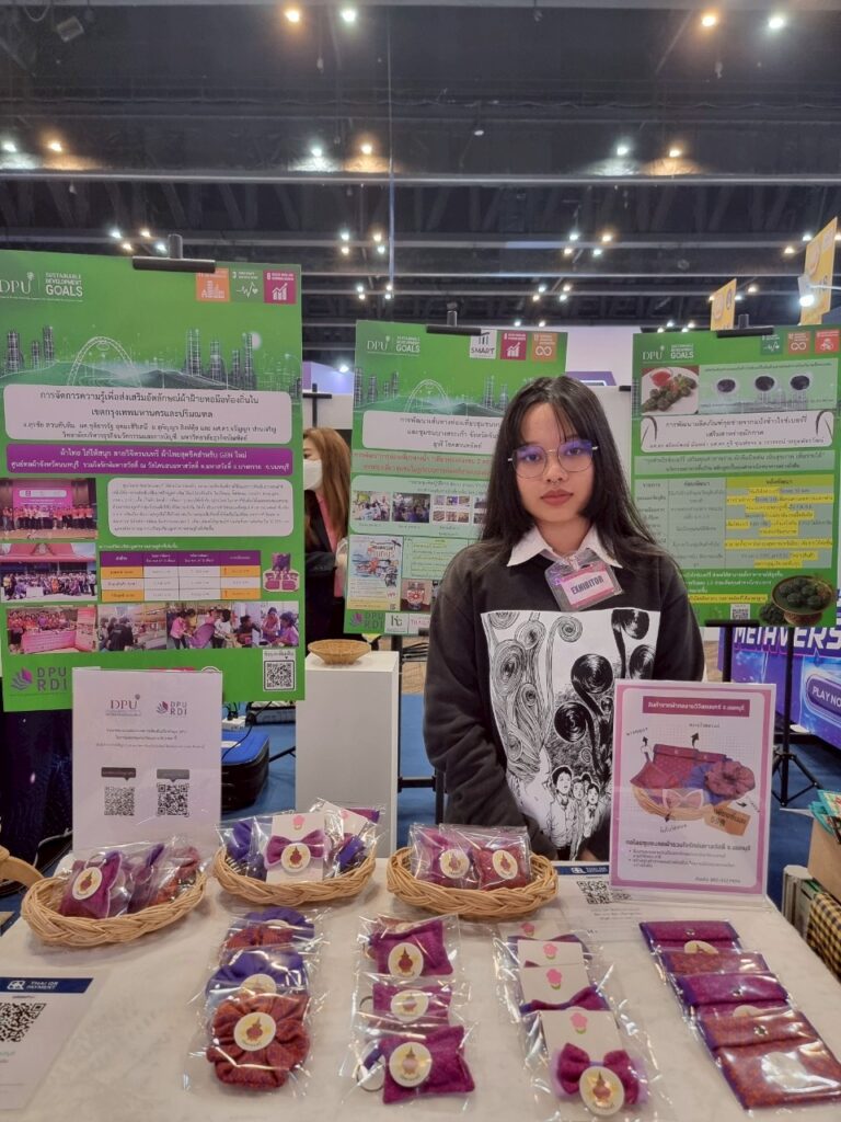 โครงการนี้เป็นอีกหนึ่งโครงการที่ได้รับคัดเลือกจาก ศูนย์วิจัยพัฒนาและนวัตกรรม (Research Development and Innovation : RDI) ของมหาวิทยาลัยธุรกิจบัณฑิตย์ ให้เข้าร่วมจัดแสดงในงาน“มหกรรมงานวิจัยแห่งชาติ 2568” โดยจัดแสดงในธีมการพัฒนาชุมชนวิสาหกิจและSMEs สอดคล้องกับSDGs(Sustainable Development Goals)ของมหาวิทยาลัยและเป็นตัวอย่างของการวิจัยเชิงประยุกต์ที่สามารถสร้างผลกระทบเชิงบวกต่อสังคมและเศรษฐกิจในระดับชุมชน ทั้งยังตอบสนองเทรนด์การอนุรักษ์สิ่งแวดล้อมในปัจจุบัน