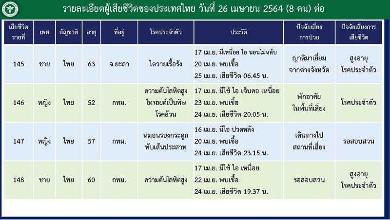 -ผู้เสียชีวิตรายที่ 148 เป็นผู้ป่วยชายไทยอายุ 60 ปี อยู่ที่กรุงเทพมหานคร มีโรคประจำตัว คือ ความดันโลหิตสูง ประวัติเมื่อวันที่ 17 เม.ย.64 มีอาการไข้ ไอ เหนื่อย วันที่ 22 เม.ย.64 พบเชื้อ วันที่ 24 เม.ย.64 เสียชีวิต ปัจจัยเสี่ยงต่อการป่วยอยู่ในขั้นตอนการสอบสวนโรค และปัจจัยเสี่ยงต่อการเสียชีวิต คือ สูงอายุและมีโรคประจำตัว