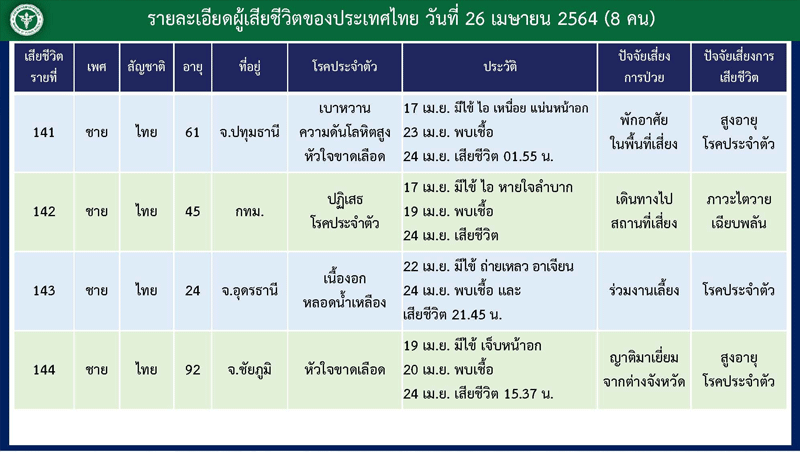 -ผู้เสียชีวิตรายที่ 144 เป็นผู้ป่วยชายไทยอายุ 92 ปี อยู่จังหวัดชัยภูมิ มีโรคประจำตัว คือ หัวใจขาดเลือด ประวัติ 19 เม.ย.64 มีไข้ เจ็บหน้าอก วันที่ 20 เม.ย.64 พบเชื้อ 24 เม.ย.64 เสียชีวิต