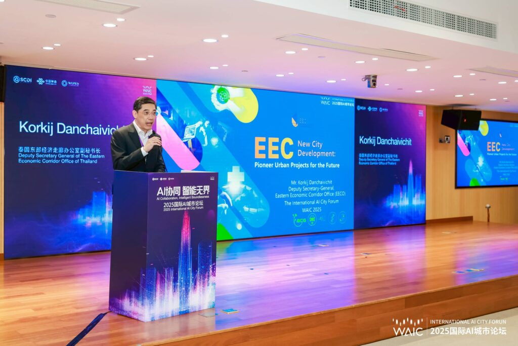 พร้อมกันนี้ คณะผู้แทนจาก สกพอ. ได้เข้าร่วมการประชุม International AI City Forum ภายใต้หัวข้อ “Urban Intelligence Awakens” ซึ่งจัดโดย Shanghai Smart City Institute โดยในเวทีนี้ นายก่อกิจฯ ได้รับเกียรติบรรยายในหัวข้อ “EEC New City Development: Pioneer Urban Projects for the Future” นำเสนอแนวคิดการพัฒนาเมืองใหม่ในเขตพัฒนาพิเศษภาคตะวันออก (EECiti) ที่มุ่งเน้นการเป็นเมืองอัจฉริยะ น่าอยู่ และยั่งยืน เพื่อรองรับการลงทุนในอุตสาหกรรมอนาคต อาทิ ปัญญาประดิษฐ์ ยานยนต์ไฟฟ้า และแพลตฟอร์มดิจิทัล