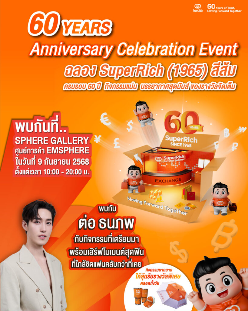 บริษัท ซุปเปอร์ริช เคอเรนซี่ เอ็กซ์เชนจ์ (1965) จำกัด หรือ “ซุปเปอร์ริช (1965) สีส้ม”ผู้นำอันดับ 1 ด้านการแลกเปลี่ยนเงินตราต่างประเทศ(No.1 Currency Exchange) ขอเชิญร่วมงานฉลองครบรอบ 60 ปีเพื่อขอบคุณลูกค้าที่ให้ความไว้วางใจในความซื่อสัตย์ ความโปร่งใส และความเชื่อถือที่มีต่อซุปเปอร์ริชสีส้มมาตลอด 6 ทศวรรษภายใต้คอนเซปต์ “60 Years of Trust, Moving Forward Together”เพื่อก้าวต่อไปอย่างมั่นใจไปด้วยกันพร้อมเปิดประสบการณ์ใหม่ ๆในการแลกเปลี่ยนเงินตราต่างประเทศที่ยกระดับทุกการเดินทาง ให้สะดวกสบายและปลอดภัยยิ่งขึ้น พบกับกิจกรรมสนุก ๆ และความบันเทิงแบบจัดเต็มตลอดทั้งวัน ลุ้นรับของรางวัลสุดพิเศษมากมายปิดท้ายด้วยกิจกรรม Meet & Greet สุดใกล้ชิด และมินิคอนเสิร์ตจาก “ต่อ–ธนภพ ลีรัตนขจร” ที่จะมอบโมเมนต์สุดฟินและใกล้ชิดแฟนคลับกว่าที่เคย