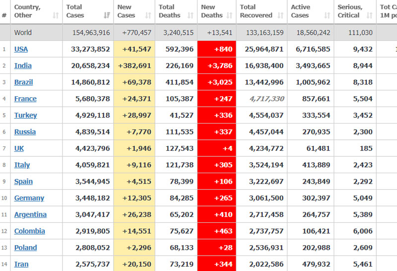 เว็บไซต์ Worldometers รายงานสถานการณ์โควิด-19 ประจำวันที่ 5 พฤษภาคม 2564 ช่วงเวลาประมาณ 07.25 น. ตามเวลาประเทศไทย พบผู้ติดเชื้อทั่วโลกแล้ว 154,963,916 ราย เพิ่มขึ้น 770,457 ราย เสียชีวิต 3,240,515 ราย เพิ่มขึ้น 13,541 ราย รักษาหาย 133,163,159 ราย