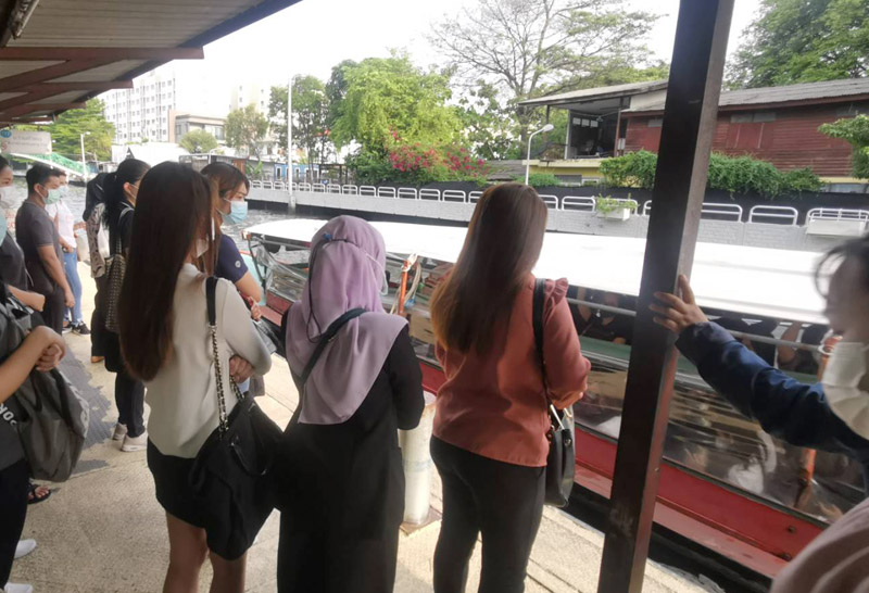 เมื่อมาถึงที่ท่าเรือรามคำแหง บนเรือจึงค่อยข้างแน่น ส่วนภายในเรือพบว่าที่นั่ง 1 แถว จะให้ผู้โดยนั่งประมาณ 2-3 คน ส่วนผู้ที่ไม่มีที่นั่งจะยืนอยู่กระจายกันอยู่ตามที่ว่าง โดยไม่สามารถเว้นระยะห่างได้ แต่จากการสังเกต ผู้โดยสารต่างป้องกันตัวเองมีการปิดแมส และพกเจลแอลกอฮอล์ ไม่พูดคุย หรือสนทนากันบนเรือ