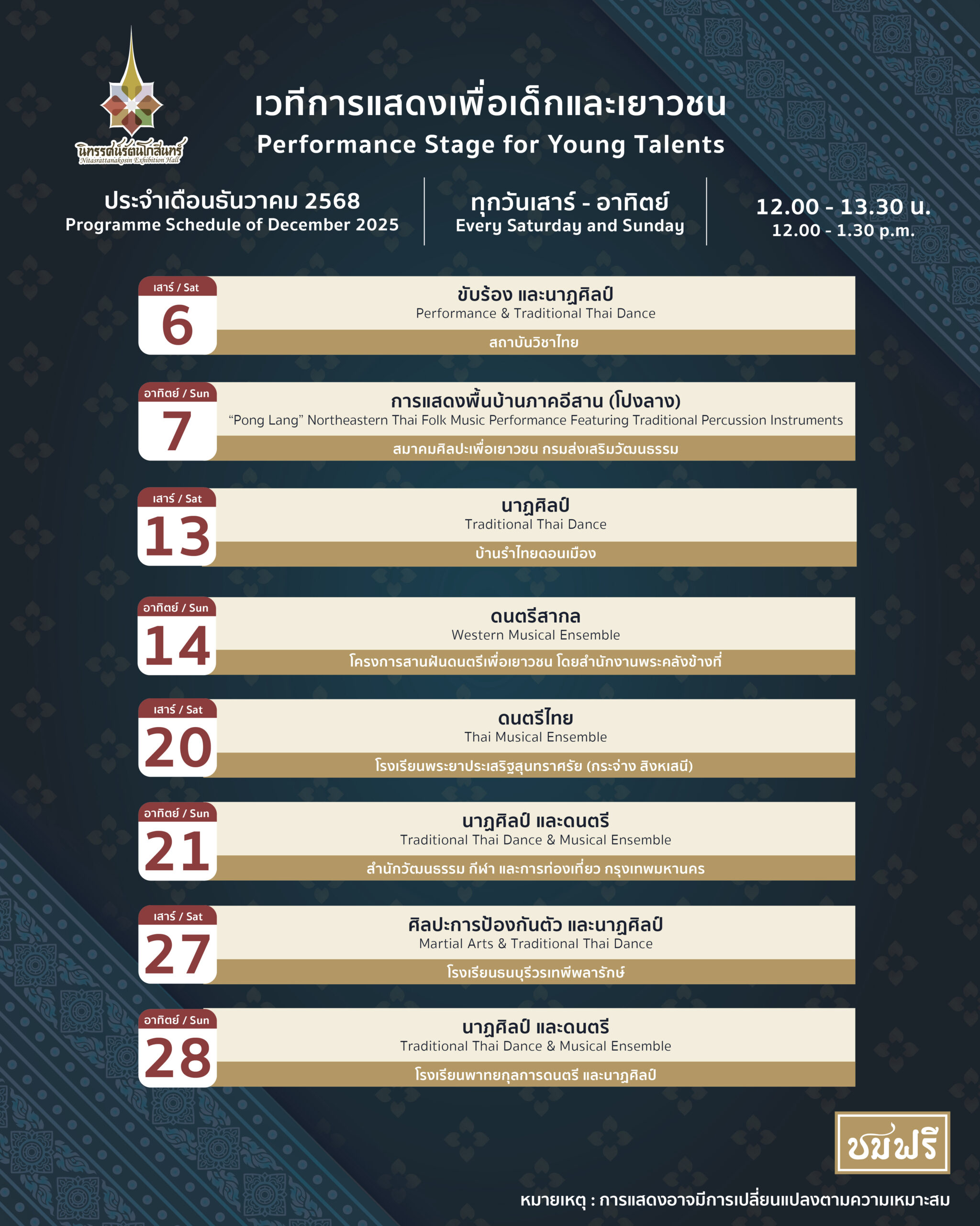 เนื่องในวันคล้ายวันพระบรมราชสมภพพระบาทสมเด็จพระบรมชนกาธิเบศร มหาภูมิพลอดุลยเดชมหาราช บรมนาถบพิตร 5 ธันวาคม 2568 เวทีการแสดงเพื่อเด็กและเยาวชน นิทรรศน์รัตนโกสินทร์ เดือนธันวาคม พบกับการแสดงขับร้อง ชุด เพลงรักจากโครงการพระราชดำริ / จินตลีลา ชุด เดินตามรอยเท้าพ่อ โดย สถาบันวิชาไทย การแสดงจินตลีลา เพลง ในดวงใจนิรันดร์ โดย บ้านรำไทยดอนเมือง การแสดงพื้นบ้านภาคอีสาน (โปงลาง) โดย สมาคมศิลปะเพื่อเยาวชน กรมส่งเสริมวัฒนธรรม และการแสดงศิลปะป้องกันตัว กระบี่กระบอง โดย โรงเรียนธนบุรีวรเทพีพลารักษ์ ชมฟรี ทุกวันเสาร์ – อาทิตย์ เวลา 12.00 – 13.30 นาฬิกา สอบถามเพิ่มเติม โทร. 09 5476 5868