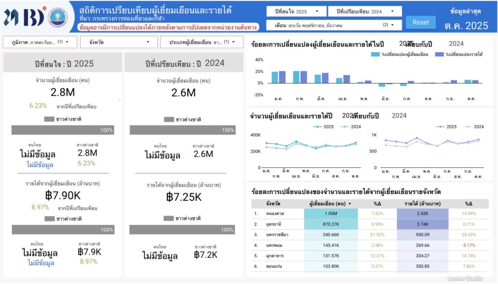 ภาพรวมดังกล่าวสะท้อนจากการวิเคราะห์ข้อมูลผ่านแดชบอร์ด “สถิติการเปรียบเทียบผู้เยี่ยมเยือนและรายได้” บนแพลตฟอร์ม TRAVEL LINK ภายใต้การดำเนินงานของ สถาบันข้อมูลขนาดใหญ่ (องค์การมหาชน) หรือ BDI ซึ่งนำข้อมูลเปิด (Open Data) จากสำนักปลัดกระทรวงการท่องเที่ยวและกีฬา ซึ่งเป็นเจ้าของข้อมูล มาประมวลผลและจัดแสดงในรูปแบบที่ช่วยให้เห็นแนวโน้มการเดินทางของผู้เยี่ยมเยือนทั้งชาวไทยและชาวต่างชาติ โดยสามารถเลือกช่วงเวลาและปีที่ต้องการเปรียบเทียบได้ตามความสนใจของผู้ใช้งาน