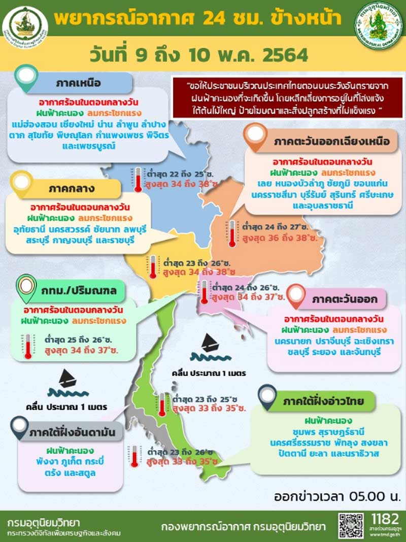 ลักษณะอากาศทั่วไป พยากรณ์อากาศ 24 ชั่วโมงข้างหน้า บริเวณประเทศไทยตอนบนมีอากาศร้อนในตอนกลางวัน ประกอบกับมีลมตะวันตกเฉียงใต้และลมตะวันออกเฉียงใต้พัดนำความชื้นจากอ่าวไทยและทะเลจีนใต้เข้ามาปกคลุมภาคเหนือ ภาคตะวันออกเฉียงเหนือ ภาคกลาง และภาคตะวันออก รวมทั้งกรุงเทพมหานครและปริมณฑล ทำให้บริเวณดังกล่าวมีฝนฟ้าคะนองกับมีลมกระโชกแรงเกิดขึ้นบางพื้นที่ ขอให้ประชาชนบริเวณประเทศไทยตอนบนระวังอันตรายจากฝนฟ้าคะนองและลมกระโชกแรงที่จะเกิดขึ้นไว้ด้วย