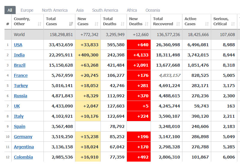 ทั่วโลกป่วยโควิดสะสม 158.2 ล้านคน เสียชีวิตกว่า 3.29ล้านคน- อินเดียป่วยเพิ่ม409,300 คน