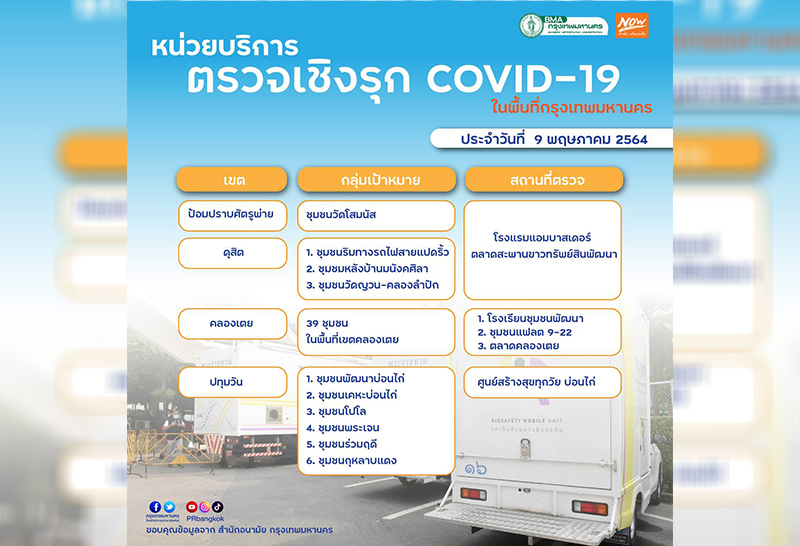 โดยในวันนี้ สำนักงานเขตดุสิต ร่วมกับศูนย์บริการสาธารณสุข 6 สโมสรวัฒนธรรมหญิง ศูนย์บริการสาธารณสุข 15 และ 33 กรมควบคุมโรค กระทรวงสาธารณสุข จัดหน่วยเคลื่อนที่ให้บริการเชิงรุกเก็บตัวอย่างส่งตรวจหาเชื้อโควิด-19 โดยนำรถพระราชทานเก็บตัวอย่างชีวนิรภัย จำนวน 2 คัน ทำการตรวจคัดกรองโควิด-19 ด้วยวิธีการตรวจหาเชื้อทางโพรงจมูก (SWAB) แก่ประชาชนในชุมชน ได้แก่ ชุมชนหลังบ้านมนังคสิลา และชุมชนวัดญวน-คลองลำปัก ชุมชนริมทางรถไฟสายแปดริ้ว และชุมชนวัดโสมนัส เขตป้อมปราบศัตรูพ่าย รวมทั้งผู้พักอาศัยบริเวณชุมชนโดยรอบ จำนวน 500 คน ณ บริเวณชั้นล่าง โรงแรมแอมบาสเดอร์ ตลาดสะพานขาวทรัพย์สินพัฒนา เขตดุสิต ในส่วนพื้นที่เขตคลองเตยดำเนินการตรวจหาเชื้อด้วยวิธี SWAB จำนวน 3 จุด ได้แก่ บริเวณโรงเรียนชุมชนหมู่บ้านพัฒนา ชุมชนแฟลต 9-22 และตลาดคลองเตย นอกจากนี้ ยังมีจุดตรวจ SWAB ในพื้นที่เขตปทุมวัน บริเวณศูนย์สร้างสุขทุกวัย บ่อนไก่ ทำการตรวจคัดกรองหาเชื้อโควิด-19 ให้กับประชาชนในชุมชนพัฒนาบ่อนไก่ ชุมชนเคหะบ่อนไก่ ชุมชนโปโล ชุมชนพระเจน ชุมชนร่วมฤดีและชุมชนกุหลาบแดง