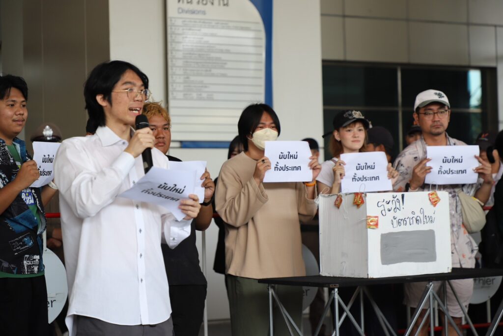 โดยกลุ่มผู้ชุมนุมได้มีการนำป้ายข้อความมาติดเพื่อเรียกร้องให้ กกต. นับคะแนนใหม่ และแสดงความไม่พอใจการทำงานของ กกต. รวมทั้งได้นำหีบบัตรเลือกตั้งจำลองซึ่งได้ติดถุงยางอนามัยมาวาง พร้อมข้อความ “ระวัง บัตรเกิดใหม่”