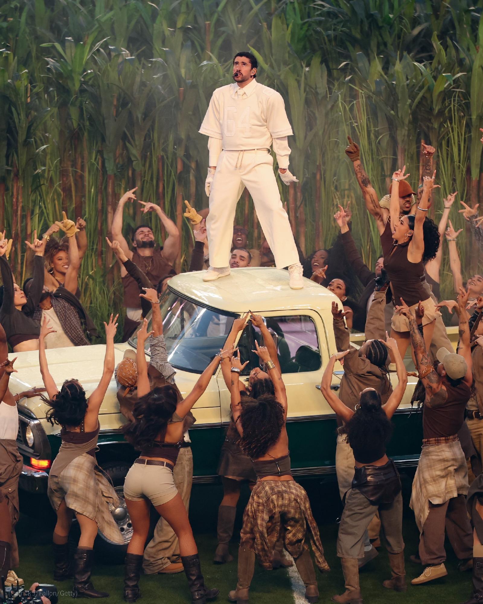 Bad Bunny ซึ่งเป็นศิลปินเชื้อสายเปอร์โตริกัน และเป็นหนึ่งในศิลปินละตินที่ประสบความสำเร็จสูงสุดในวงการเพลงโลก ขึ้นแสดงต่อหน้าผู้ชมหลายหมื่นคนในสนาม และผู้ชมทางโทรทัศน์หลายสิบล้านคนทั่วประเทศ โดยโชว์ของเขาเน้นเพลงภาษาสเปนเป็นหลัก และสอดแทรกธีมเกี่ยวกับความหลากหลายทางวัฒนธรรม พร้อมข้อความบนเวทีว่า “Together We Are America”