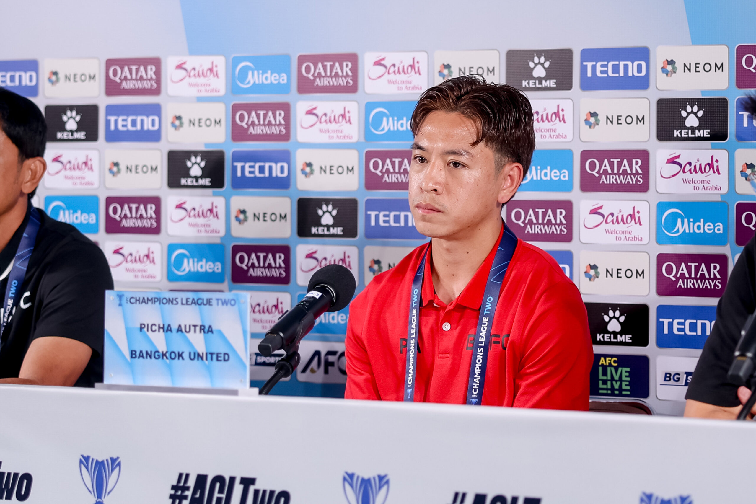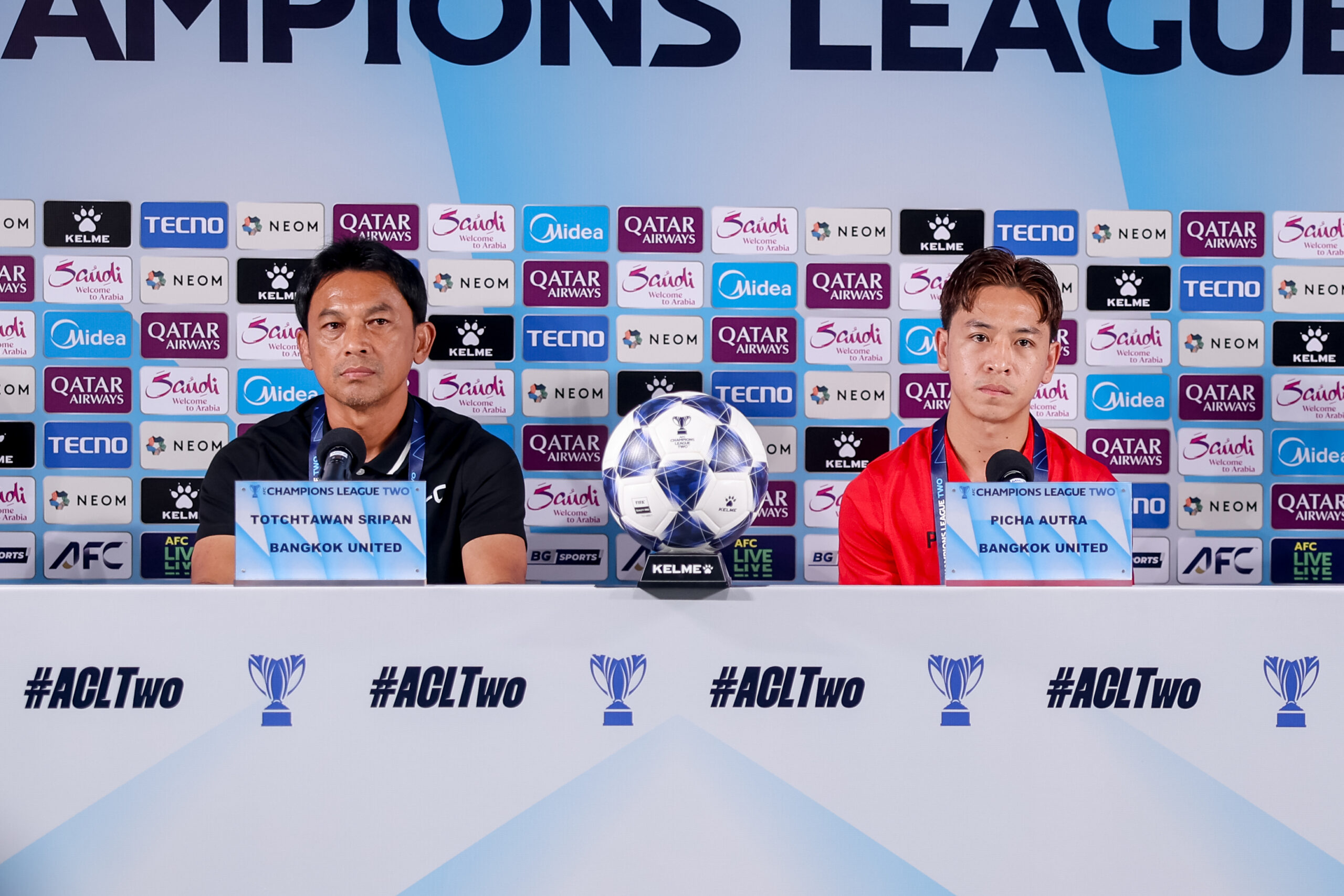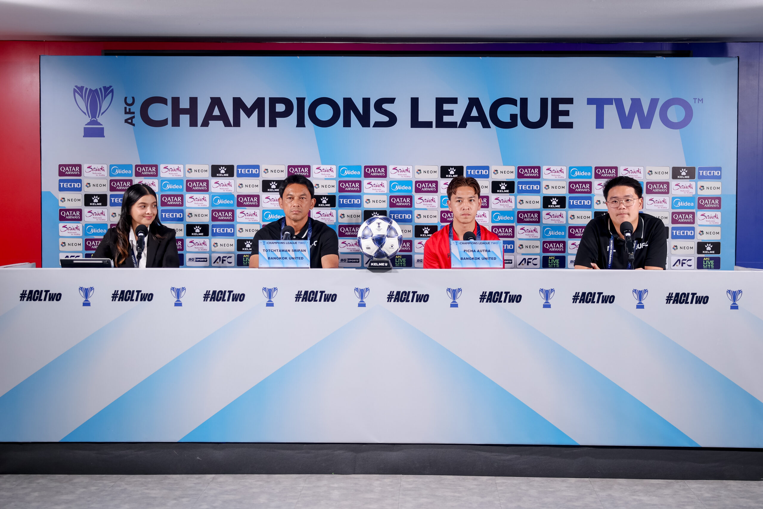 ณ ห้องแถลงข่าวสนาม ทรู บีจี สเตเดี้ยม “โค้ชแบน” ธชตวัน ศรีปาน และ พิชา อุทรา ร่วมแถลงข่าว การแข่งขัน ฟุตบอล เอเอฟซี แชมเปี้ยนส์ ลีก ทู 2025/26 รอบ 16 ทีมสุดท้าย นัดแรก ทรู แบงค็อก ยูไนเต็ด พบ แม็คคาเธอร์ เอฟซี ในวันพรุ่งนี้
