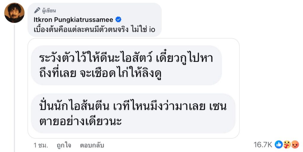 ล่าสุดทำเอาแฟนๆแห่ส่งกำลังใจให้ “จ๋าย ไททศมิตร” เมื่อเจ้าตัวถูกขู่ฆ่า โดยโพสต์ข้อความว่า “ที่เห็นเงียบๆไป ไม่มีอะไร ผมโดนขู่ฆ่า ขู่ทำร้ายร่างกายครับ ผมว่ามันชักจะไปกันใหญ่ กำลังให้ทนายจัดการเรื่องนี้” และยังแปะภาพคอมเมนต์ พร้อมเขียนว่า “เบื้องต้นคือแต่ละคนมีตัวตนจริง ไม่ใช่ io“