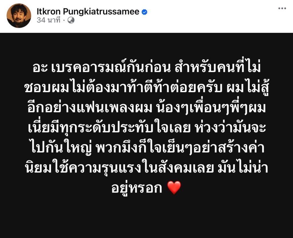 ต่อจากนั้นเจ้าตัวก็โพสต์ต่ออีกว่า “อะ เบรคอารมณ์กันก่อน สำหรับคนที่ไม่ชอบผมไม่ต้องมาท้าตีท้าต่อยครับ ผมไม่สู้อีกอย่างแฟนเพลงผม น้องๆเพื่อนๆพี่ๆผมเนี่ยมีทุกระดับประทับใจเลย ห่วงว่ามันจะไปกันใหญ่ พวกมึงก็ใจเย็นๆอย่าสร้างค่านิยมใช้ความรุนแรงในสังคมเลย มันไม่น่าอยู่หรอก❤️” ทำเอาแฟนคลับได้มาคอมเมนต์ด้วยความเป็นห่วงสนั่น