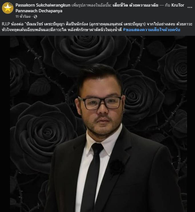 โดยทางด้านเพจดังได้ออกมาโพสต์ภาพไว้อาลัย “ต่อ KPN” พร้อมระบุว่า ”R.I.P น้องต่อ “ปัณณวัชร์ เดชะปัญญา ศิลปินนักร้อง (ลูกชายคุณอนุสรณ์ เดชะปัญญา) จากไปอย่างสงบ ด้วยภาวะหัวใจหยุดเต้นเฉียบพลันและมีภาวะไต หลังพักรักษาผ่าตัดนิ่วในถุงน้ำดี #ขอแสดงความเสียใจด้วยครับ“
