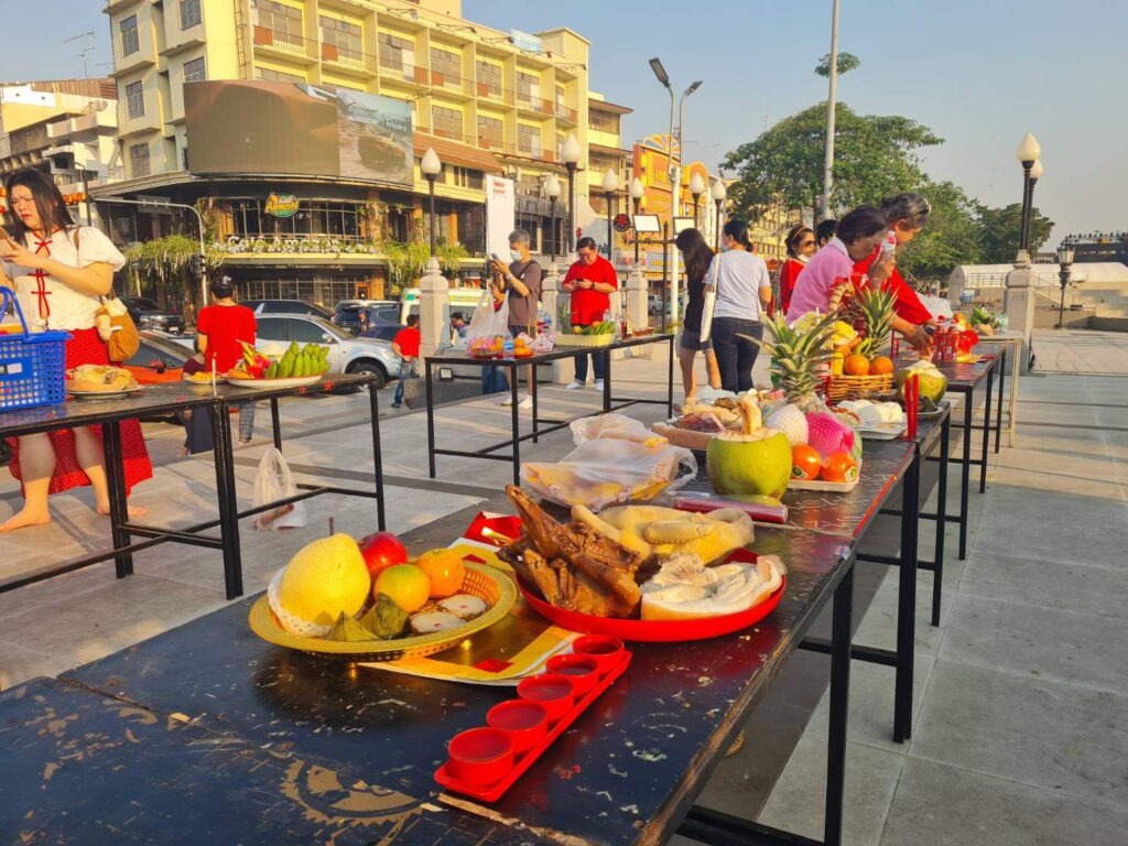 โดยบรรยากาศรอบบริเวณลานอนุสาวรีย์ท้าวสุรนารี พบว่า เครื่องเซ่นไหว้ที่ประชาชนนำมาในปีนี้ ยังคงเน้นตามธรรมเนียมโบราณที่มีความหมายอันเป็นมงคล ประกอบด้วย อาหารคาว อย่างเช่น ไก่ต้ม เป็ดพะโล้ และหมูต้ม นอกจากนี้ ยังมีผลไม้มงคลนานาชนิด อาทิ ส้ม แอปเปิ้ล และสับปะรด รวมถึง ขนมเข่งและขนมเทียน ที่จัดวางอย่างสวยงาม ท่ามกลางเสียงประทัดที่ดังขึ้นเป็นระยะ ตามความเชื่อในการขับไล่สิ่งชั่วร้าย